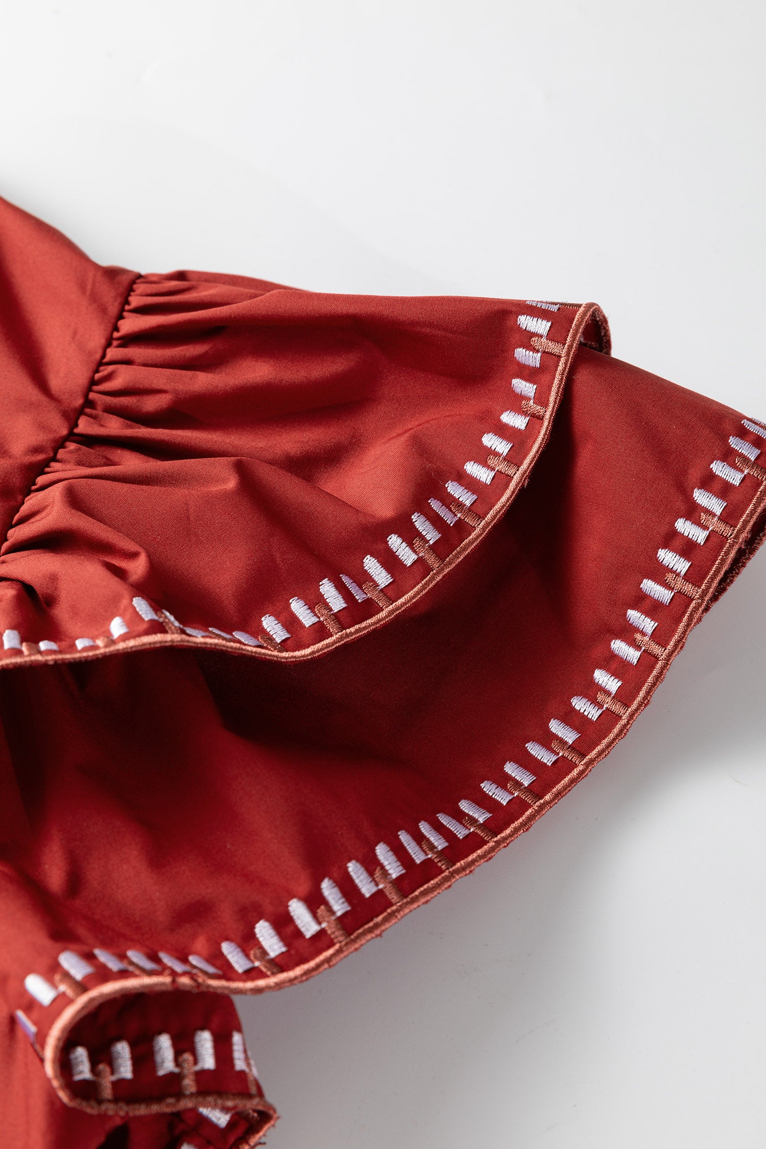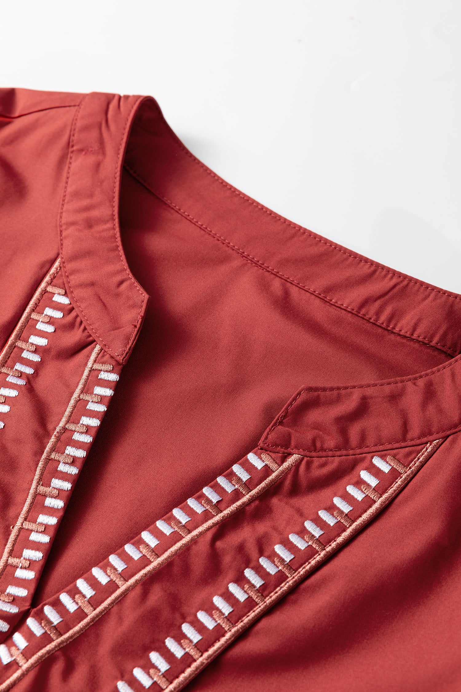 This solid colored blouse has subtle embroidered details.